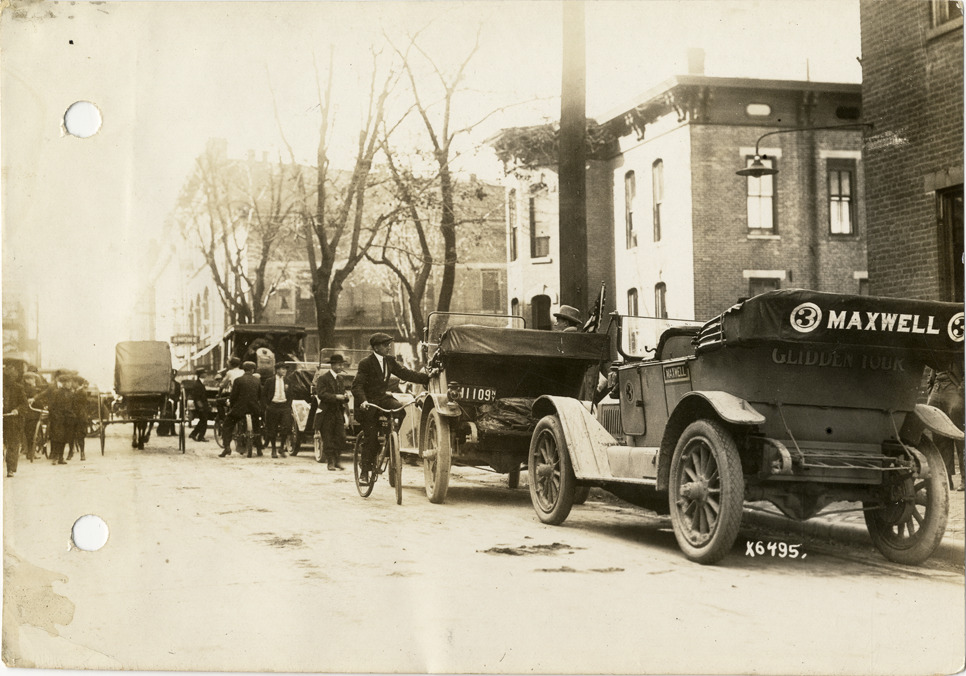View of cars lined up in street at Bluffton, Indiana during the 1912 Glidden Tour. Maxwell car in foreground; man on bicycle in street. Although the official 1912 Glidden Tour was canceled, Charles Glidden led a caravan over the identical route that had been originally planned, from Detroit, Michigan to New Orleans, Louisiana. Stamped on back: "Spooner & Wells, Inc., photographers, 1231 Woodward Ave., Detroit, Mich., telephone North 1745." Handwritten on back: "Glidden tourists stop in Bluffton, Ind., 1912. Tours--Glidden Tour, 1912."