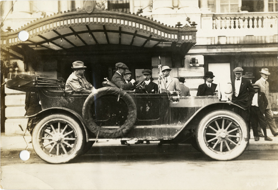 View of motorists in car at Nashville, Tennessee during the 1912 Glidden Tour. Hermitage Hotel in background. Stamped on back: "Spooner & Wells, Inc., photographers, 1231 Woodward Ave., Detroit, Mich., telephone North 1745." Although the official 1912 Glidden Tour was canceled, Charles Glidden led a caravan over the identical route that had been originally planned, from Detroit, Michigan to New Orleans, Louisiana. Handwritten on back: "Glidden tourists leaving Nashville, Tenn., October 19, 1912. Tours--Glidden Tour, 1912."