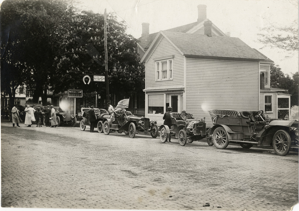 View of cars lined up in street during the 1912 Glidden Tour. Commercial buildings and signs for Roe's Garage and O.B. Satterley bicycle repair shop in background. Although the official 1912 Glidden Tour was canceled, Charles Glidden led a caravan over the identical route that had been originally planned, from Detroit, Michigan to New Orleans, Louisiana. Handwritten on back: "Tours--Glidden Tour, 1912."
