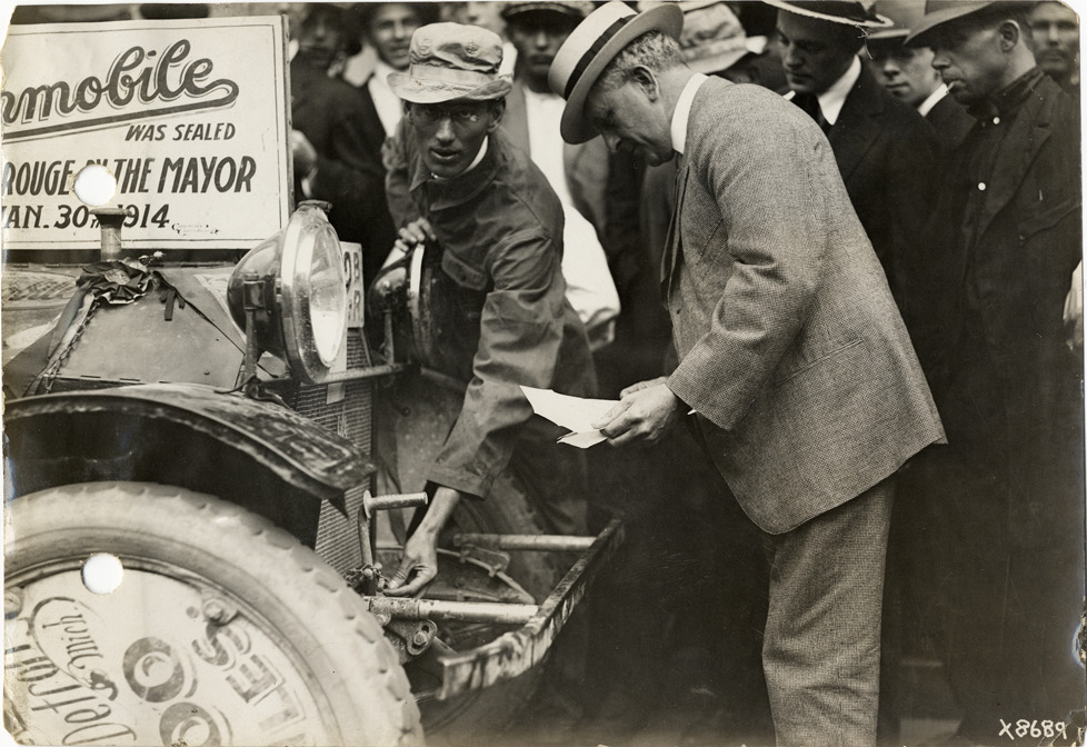 Fred Perkins and official examining front end of Hupmobile at Detroit, 1914 Hupmobile Baton Rouge to Detroit tour
