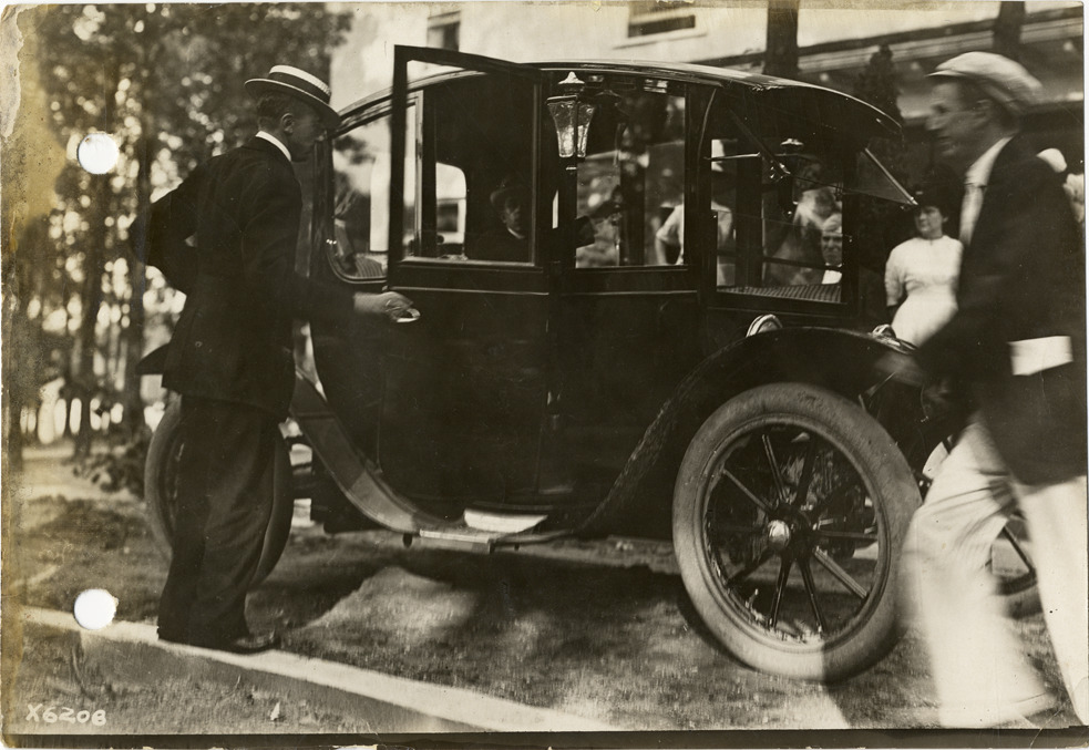 View of man getting into Flanders electric car at the farm of Walter E. Flanders, Orchard Lake, Michigan, during the pathfinding expedition for the 1912 Glidden Tour. The American Press Humorists were hosted at an event at the farm. The pathfinding tour covered a route from Detroit, Michigan to New Orleans, Louisiana, but the 1912 Glidden Tour was canceled. Handwritten on back: "Press humorists at Mr. Flanders farm, Sept., 1912. Tours--Glidden Tour, 1912."
