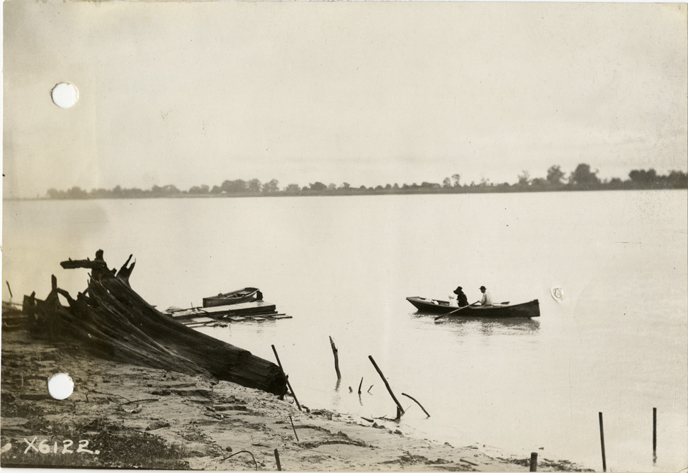 View of man and woman rowing a canoe on the Mississippi River between Darrow and New Orleans, Louisiana during the pathfinding expedition for the 1912 Glidden Tour. The pathfinding tour covered a route from Detroit, Michigan to New Orleans, Louisiana, but the 1912 Glidden Tour was canceled. Handwritten on back: "Along the Mississippi between Darrow and New Orleans, on pathfinding trip, 1912. Tours--Glidden Tour, 1912."