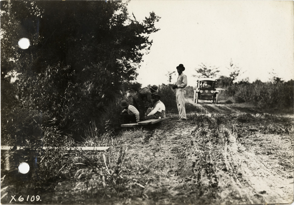 View of Flanders electric car passing group of men on side of levee road during the pathfinding expedition for the 1912 Glidden Tour. The pathfinding tour covered a route from Detroit, Michigan to New Orleans, Louisiana, but the 1912 Glidden Tour was canceled. Handwritten on back: "Pathfinder along the levee road in the mud, 1912. Tours--Glidden Tour, 1912."