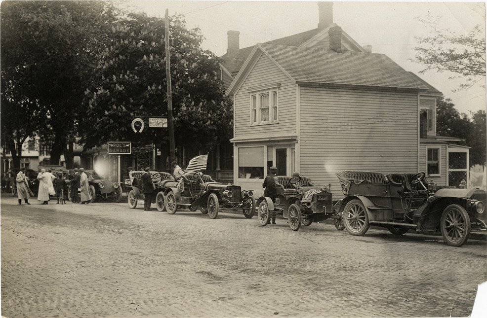 View of cars lined up in street during the 1912 Glidden Tour. Commercial buildings and signs for Roe's Garage and O.B. Satterley bicycle repair shop in background. Although the official 1912 Glidden Tour was canceled, Charles Glidden led a caravan over the identical route that had been originally planned, from Detroit, Michigan to New Orleans, Louisiana. Handwritten on back: "Tours--Glidden Tour, 1912."