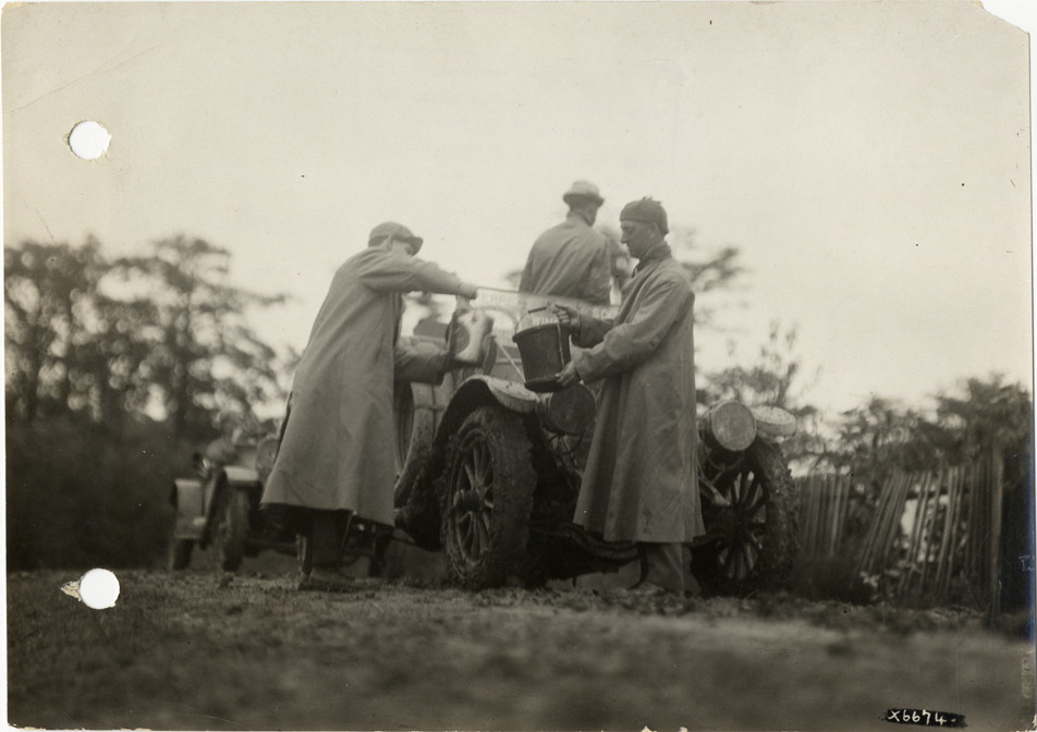View of motorists adding fluids to car on rural road in Mississippi during the 1912 Glidden Tour. Stamped on back: "Spooner & Wells, Inc., photographers, 1231 Woodward Ave., Detroit, Mich., telephone North 1745." Although the official 1912 Glidden Tour was canceled, Charles Glidden led a caravan over the identical route that had been originally planned, from Detroit, Michigan to New Orleans, Louisiana. Handwritten on back: "Muddy roads in Mississippi, Glidden Tour, 1912. Tours--Glidden Tour, 1912."