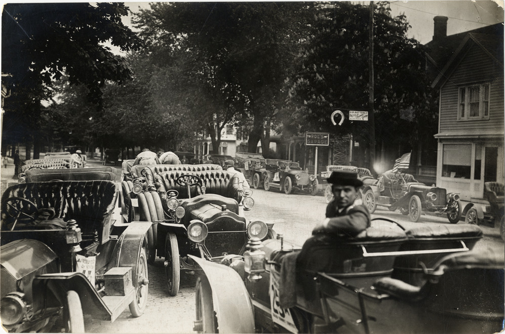 View of cars lined up in street during the 1912 Glidden Tour. Commercial buildings and signs for Roe's Garage and O.B. Satterley bicycle repair shop in background. Although the official 1912 Glidden Tour was canceled, Charles Glidden led a caravan over the identical route that had been originally planned, from Detroit, Michigan to New Orleans, Louisiana. Handwritten on back: "Tours--Glidden Tour, 1912."