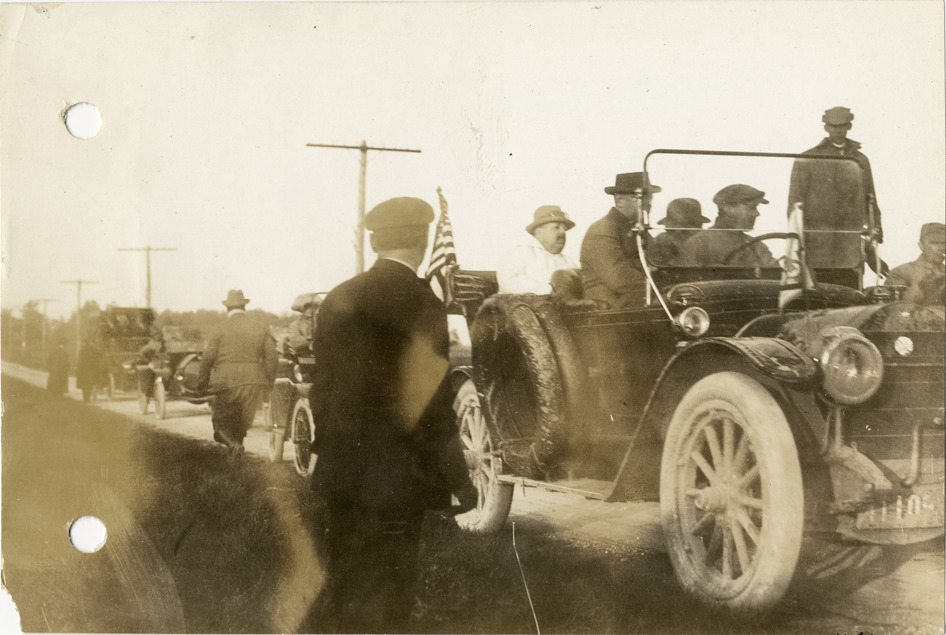 View of motorists with cars lined up in road during the 1912 Glidden Tour. Although the official 1912 Glidden Tour was canceled, Charles Glidden led a caravan over the identical route that had been originally planned, from Detroit, Michigan to New Orleans, Louisiana. Stamped on back: "Spooner & Wells, Inc., photographers, 1231 Woodward Ave., Detroit, Mich., telephone North 1745." Handwritten on back: "A lineup on the road, Glidden Tour, 1912. Tours--Glidden Tour, 1912."