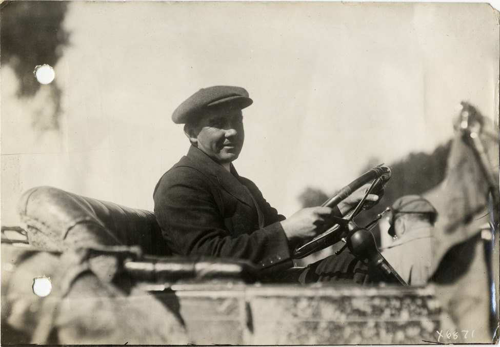 Close-up view of driver Harry E. Walls in Maxwell car during the 1912 Glidden Tour. Although the official 1912 Glidden Tour was canceled, Charles Glidden led a caravan over the identical route that had been originally planned, from Detroit, Michigan to New Orleans, Louisiana. Handwritten on back: "Mr. Walls, driver of official car, Glidden Tour, 1912. Tours--Glidden Tour, 1912."