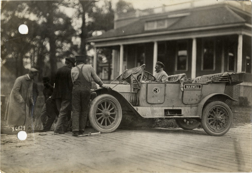 View of men surrounding Maxwell car in ditch near Magnolia, Mississippi during the 1912 Glidden Tour. Although the official 1912 Glidden Tour was canceled, Charles Glidden led a caravan over the identical route that had been originally planned, from Detroit, Michigan to New Orleans, Louisiana. Handwritten on back: "Maxwell #3 ditched 15 miles from Magnolia, La., Glidden Tour, 1912. Tours--Glidden Tour, 1912."