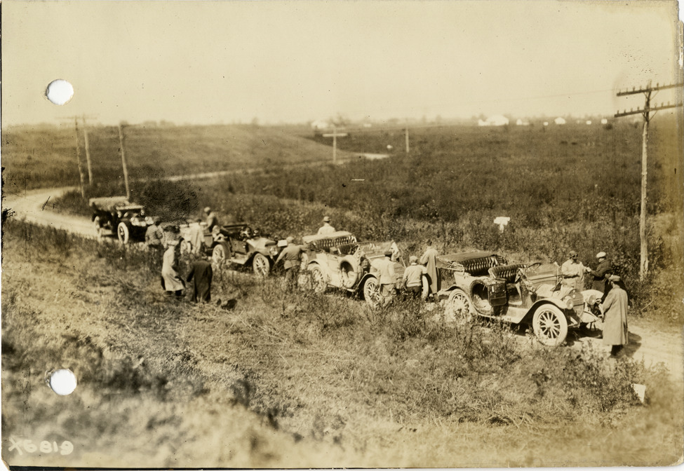 View of motorists with cars on Mississippi River levee road during the 1912 Glidden Tour. Although the official 1912 Glidden Tour was canceled, Charles Glidden led a caravan over the identical route that had been originally planned, from Detroit, Michigan to New Orleans, Louisiana. Stamped on back: "Spooner & Wells, Inc., photographers, 1231 Woodward Ave., Detroit, Mich., telephone North 1745." Handwritten on back: "View of autos from Mississippi levee, Glidden Tour, 1912. Tours--Glidden Tour, 1912."
