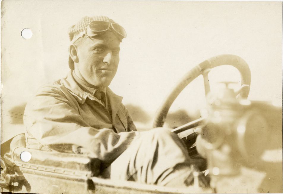 Close-up view of Howard J. Watrous in Hupmobile car during the 1912 Glidden Tour. Although the official 1912 Glidden Tour was canceled, Charles Glidden led a caravan over the identical route that had been originally planned, from Detroit, Michigan to New Orleans, Louisiana. Stamped on back: "Spooner & Wells, Inc., photographers, 1231 Woodward Ave., Detroit, Mich., telephone North 1745." Handwritten on back: "Mr. Watrous in Hupmobile on trip from Detroit to New Orleans, 1912. Tours--Glidden Tour, 1912."