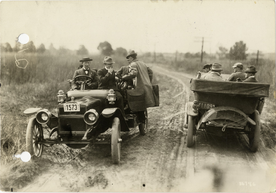 View of motorists in two cars on rural dirt road, facing in opposite directions, at Vicksburg, Mississippi during the 1912 Glidden Tour. Although the official 1912 Glidden Tour was canceled, Charles Glidden led a caravan over the identical route that had been originally planned, from Detroit, Michigan to New Orleans, Louisiana. Stamped on back: "Photo by N. Lazarnick." Handwritten on back: "Greeting at Vicksburg, Glidden Tour, 1912. Tours--Glidden Tour, 1912."