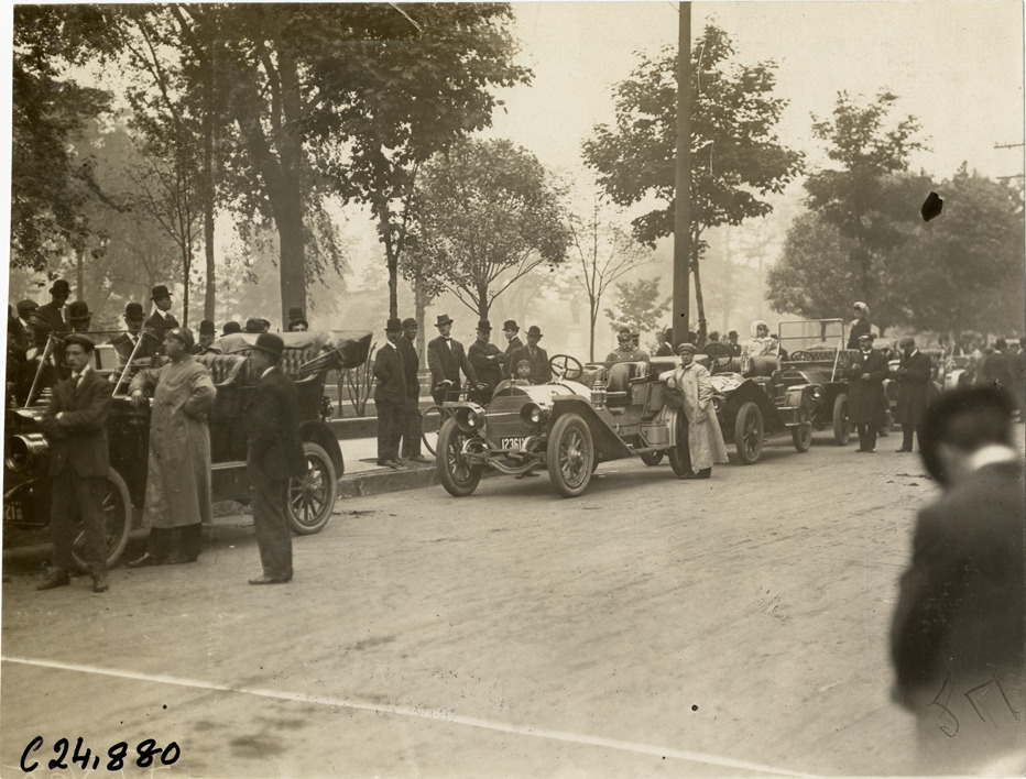 View of cars lined up in street during the 1909 Hackettstown Endurance Run. Spectators stand on sidewalk. Sponsored by the New Jersey Automobile and Motor Club, the endurance run followed a route between Newark and Hackettstown, New Jersey. Handwritten on back: "Tours--Hackettstown Endurance Run, 1909."