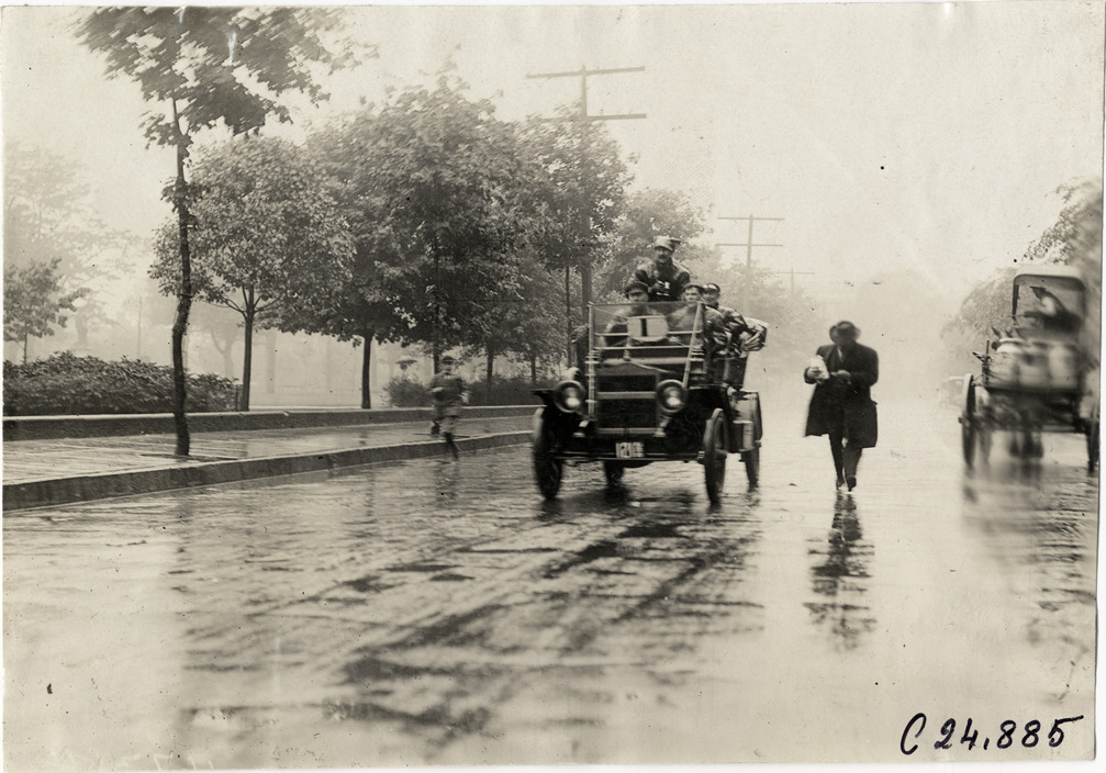 View of motorists in Maxwell car no. 1 traveling on rain-slicked street during the 1909 Hackettstown Endurance Run. Man walks alongside car. Sponsored by the New Jersey Automobile and Motor Club, the endurance run followed a route between Newark and Hackettstown, New Jersey. Stamped on back: "Spooner and Wells, 1931 Broadway, New York, duplicates any time, enlargements all sizes, tel. 3472-3473 Col., credit appreciated." Handwritten on back: "Maxwell. Tours--Hackettstown Endurance Run, 1909."