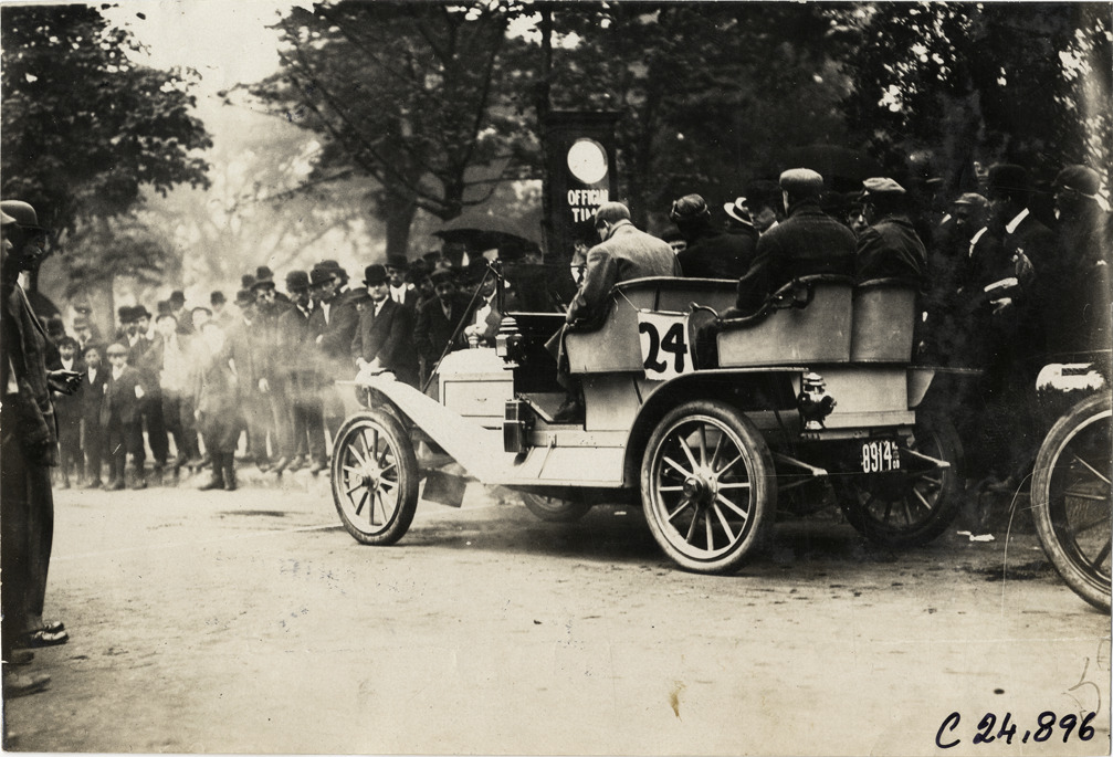 Rear view of motorists in Crawford car no. 24 during the 1909 Hackettstown Endurance Run. Spectators in background. Sponsored by the New Jersey Automobile and Motor Club, the endurance run followed a route between Newark and Hackettstown, New Jersey. Stamped on back: "Spooner and Wells, 1931 Broadway, New York, duplicates any time, enlargements all sizes, tel. 3472-3473 Col., credit appreciated." Handwritten on back: "Crawford. Tours--Hackettstown Endurance Run, 1909."