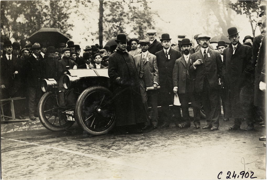 View of officials posing with car during the 1909 Hackettstown Endurance Run. Spectators in background. Sponsored by the New Jersey Automobile and Motor Club, the endurance run followed a route between Newark and Hackettstown, New Jersey. Handwritten on back: "Tours--Hackettstown Endurance Run, 1909."