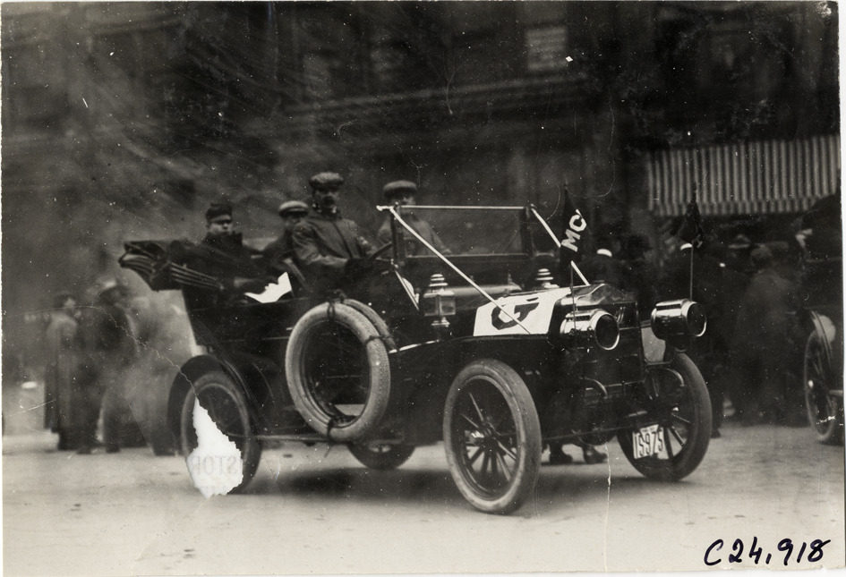 View of motorists in car during the 1909 Harrisburg Endurance Run. Car displays "G" sign on hood. Sponsored by the Motor Club of Harrisburg, Pennsylvania, the reliability contest covered routes through Maryland, Pennsylvania and Washington, D.C. Stamped on back: "Spooner & Wells, Inc., photographers, telephones 3472-3473 Columbus, 1931 Broadway, New York." Handwritten on back: "Tours--Harrisburg Endurance Run, 1909."