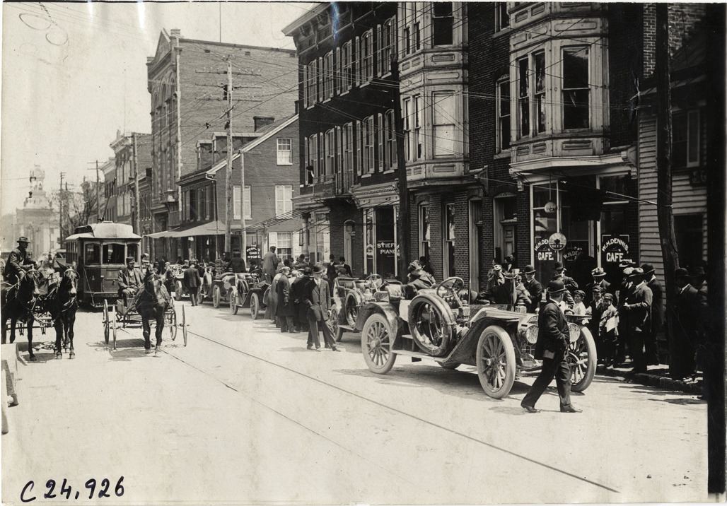View of cars lined up in street in front of commercial buildings during the 1909 Harrisburg Endurance Run. Horse-drawn wagons and streetcar in background. Sponsored by the Motor Club of Harrisburg, Pennsylvania, the reliability contest covered routes through Maryland, Pennsylvania and Washington, D.C. Stamped on back: "Spooner & Wells, Inc., photographers, telephones 3472-3473 Columbus, 1931 Broadway, New York." Handwritten on back: "Tours--Harrisburg Endurance Run, 1909."