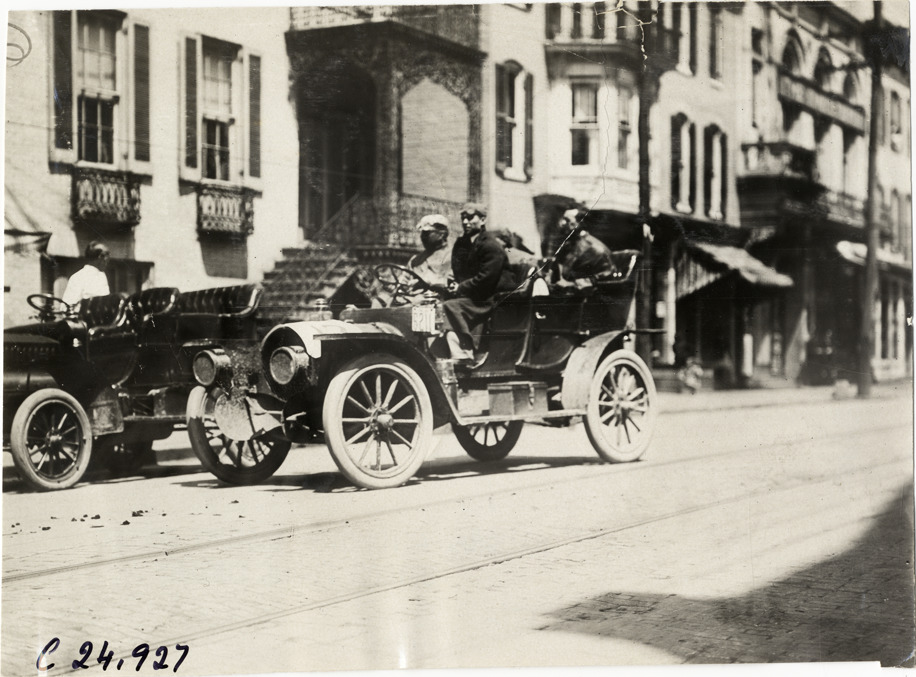 View of motorists in Franklin car during the 1909 Harrisburg Endurance Run. Buildings in background. Sponsored by the Motor Club of Harrisburg, Pennsylvania, the reliability contest covered routes through Maryland, Pennsylvania and Washington, D.C. Stamped on back: "Spooner & Wells, Inc., photographers, telephones 3472-3473 Columbus, 1931 Broadway, New York." Handwritten on back: "Tours--Harrisburg Endurance Run, 1909."