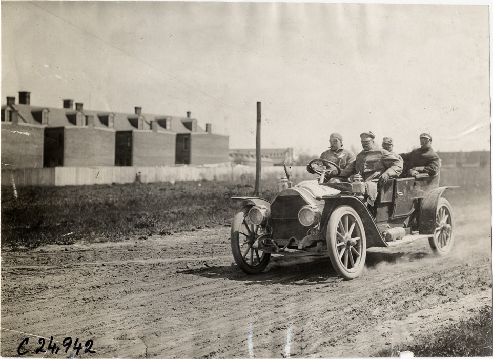 View of motorists in car traveling on dirt road during the 1909 Harrisburg Endurance Run. Sponsored by the Motor Club of Harrisburg, Pennsylvania, the reliability contest covered routes through Maryland, Pennsylvania and Washington, D.C. Stamped on back: "Spooner & Wells, Inc., photographers, telephones 3472-3473 Columbus, 1931 Broadway, New York." Handwritten on back: "Tours--Harrisburg Endurance Run, 1909."