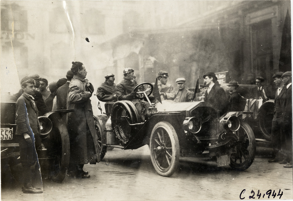 View of motorists in Pullman car, surrounded by several spectators, during the 1909 Harrisburg Endurance Run. Sponsored by the Motor Club of Harrisburg, Pennsylvania, the reliability contest covered routes through Maryland, Pennsylvania and Washington, D.C. Stamped on back: "Spooner & Wells, Inc., photographers, telephones 3472-3473 Columbus, 1931 Broadway, New York." Handwritten on back: "Tours--Harrisburg Endurance Run, 1909."