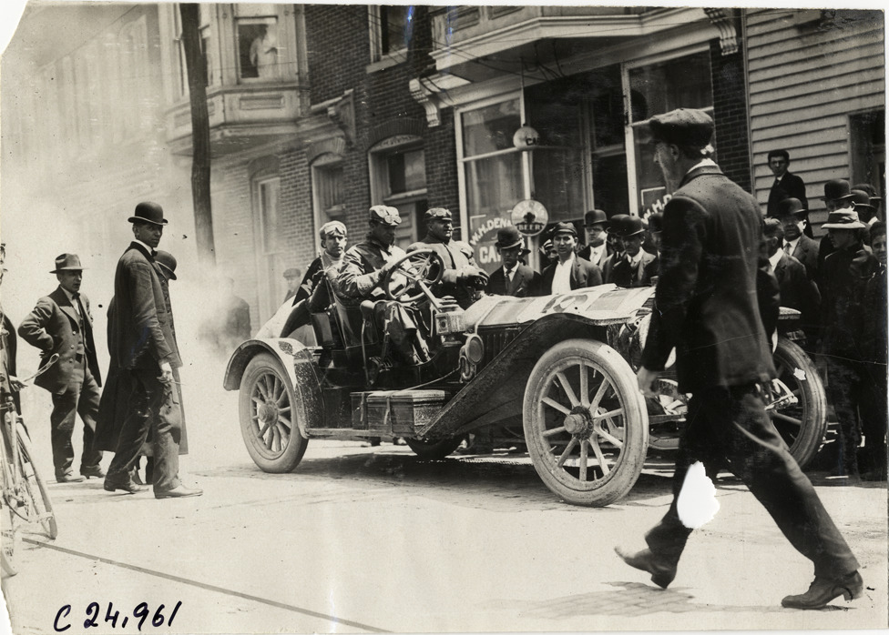 View of motorists in Peerless car no. 15 during the 1909 Harrisburg Endurance Run. Man walks in foreground; spectators and stores in background. Sponsored by the Motor Club of Harrisburg, Pennsylvania, the reliability contest covered routes through Maryland, Pennsylvania and Washington, D.C. Stamped on back: "Spooner & Wells, Inc., photographers, telephones 3472-3473 Columbus, 1931 Broadway, New York." Handwritten on back: "Tours--Harrisburg Endurance Run, 1909."
