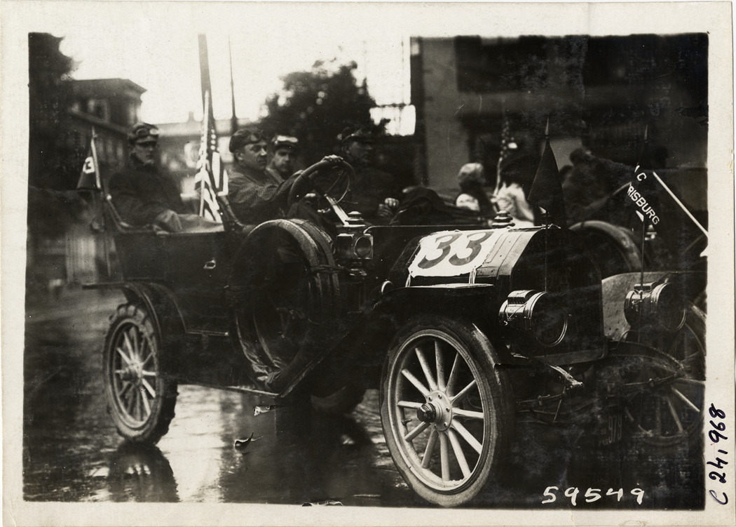 View of motorists in car no. 33 during the 1910 Harrisburg Endurance Run. The Motor Club of Harrisburg, Pennsylvania sponsored spring and fall reliability contests which covered routes through Pennsylvania, Maryland and New Jersey. Stamped on back: "Spooner & Wells, Inc., photographers, telephones 3472-3473 Columbus, 1931 Broadway, New York." Handwritten on back: "Tours--Harrisburg Endurance Run, 1910."
