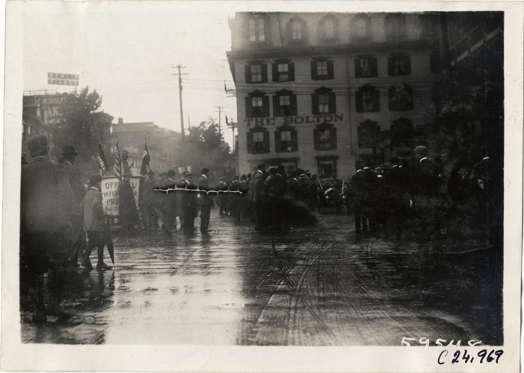 View of crowd surrounding motorists in car at Harrisburg, Pennsylvania during the 1910 Harrisburg Endurance Run. Bolton Hotel in background. The Motor Club of Harrisburg, Pennsylvania sponsored spring and fall reliability contests which covered routes through Pennsylvania, Maryland and New Jersey. Stamped on back: "Spooner & Wells, Inc., photographers, telephones 3472-3473 Columbus, 1931 Broadway, New York." Handwritten on back: "Tours--Harrisburg Endurance Run, 1910."