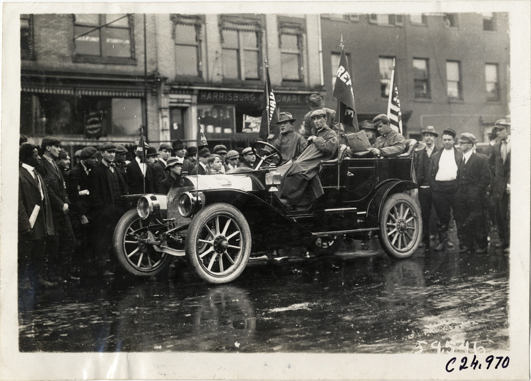 Motorists in automobile at Harrisburg, Pennsylvania, 1910 Harrisburg Endurance Run