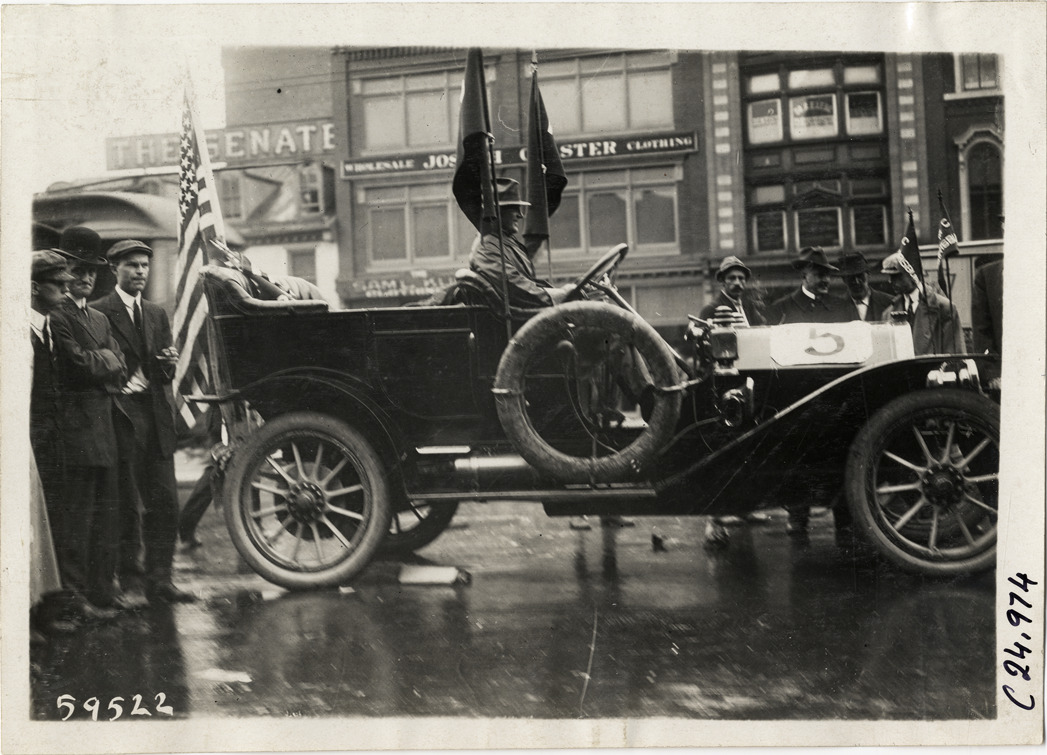 View of driver in car no. 5 during the 1910 Harrisburg Endurance Run. Spectators stand nearby; commercial buildings in background. The Motor Club of Harrisburg, Pennsylvania sponsored spring and fall reliability contests which covered routes through Pennsylvania, Maryland and New Jersey. Stamped on back: "Spooner & Wells, Inc., photographers, telephones 3472-3473 Columbus, 1931 Broadway, New York." Handwritten on back: "Tours--Harrisburg Endurance Run, 1910."