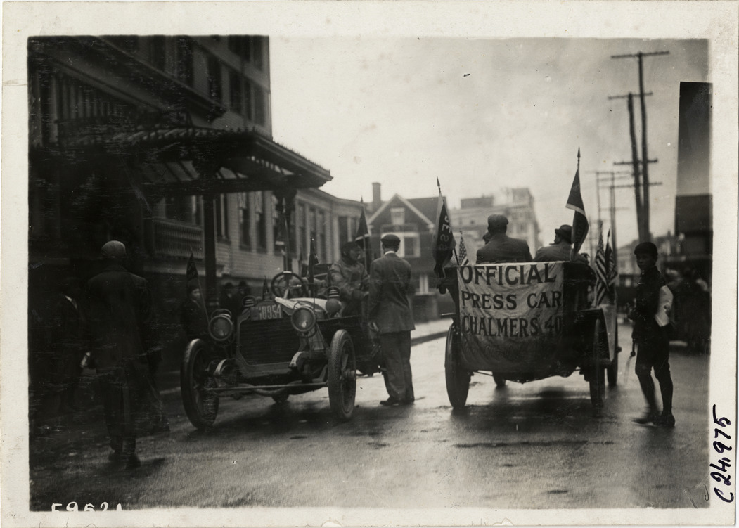 View of motorists in Chalmers press car and unidentified car, facing in opposite directions in street, during the 1910 Harrisburg Endurance Run. "Official press car, Chalmers 40" banner is displayed on back of car. The Motor Club of Harrisburg, Pennsylvania sponsored spring and fall reliability contests which covered routes through Pennsylvania, Maryland and New Jersey. Stamped on back: "Spooner & Wells, Inc., photographers, telephones 3472-3473 Columbus, 1931 Broadway, New York." Handwritten on back: "Tours--Harrisburg Endurance Run, 1910."