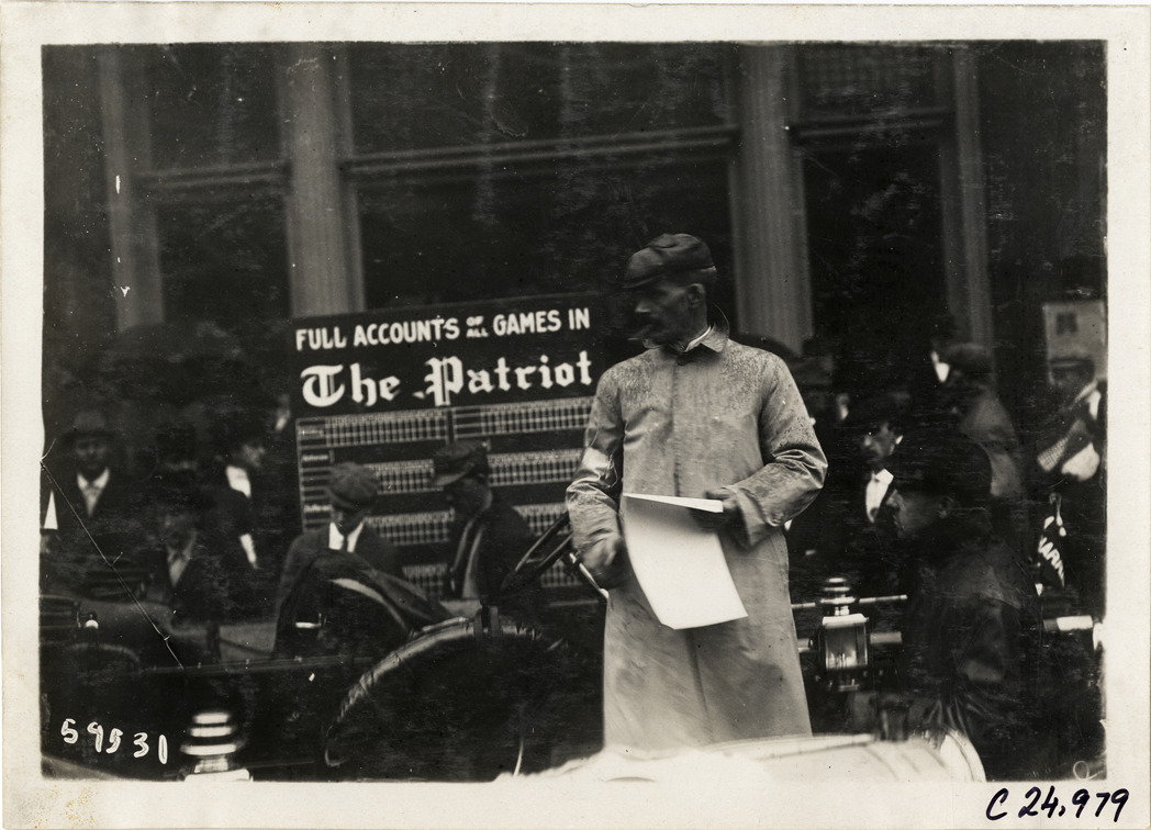 View of official holding document during the 1910 Harrisburg Endurance Run. Car and scoreboard in background. Sign on scoreboard reads: "Full accounts of all games in The Patriot." The Motor Club of Harrisburg, Pennsylvania sponsored spring and fall reliability contests which covered routes through Pennsylvania, Maryland and New Jersey. Stamped on back: "Spooner & Wells, Inc., photographers, telephones 3472-3473 Columbus, 1931 Broadway, New York." Handwritten on back: "Tours--Harrisburg Endurance Run, 1910."