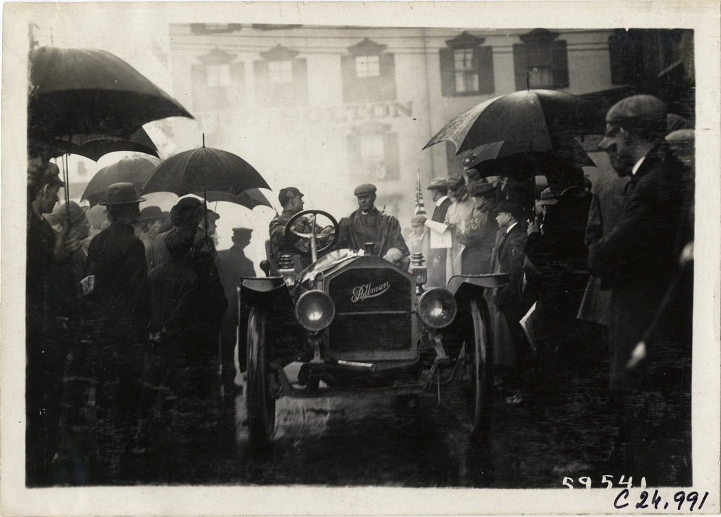 View of spectators surrounding motorists in Pullman car at Harrisburg, Pennsylvania during the 1910 Harrisburg Endurance Run. Some spectators holds umbrellas; Bolton Hotel in background. The Motor Club of Harrisburg, Pennsylvania sponsored spring and fall reliability contests which covered routes through Pennsylvania, Maryland and New Jersey. Stamped on back: "Spooner & Wells, Inc., photographers, telephones 3472-3473 Columbus, 1931 Broadway, New York." Handwritten on back: "Tours--Harrisburg Endurance Run, 1910."