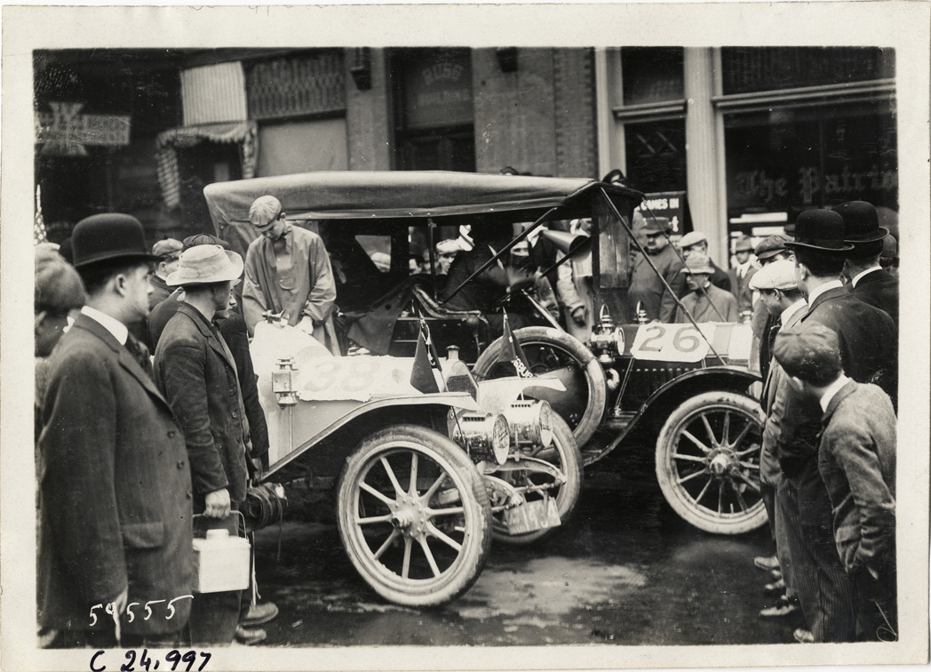 View of spectators surrounding motorists in car no. 26 and car no. 38 during the 1910 Harrisburg Endurance Run. The Motor Club of Harrisburg, Pennsylvania sponsored spring and fall reliability contests which covered routes through Pennsylvania, Maryland and New Jersey. Stamped on back: "Spooner & Wells, Inc., photographers, telephones 3472-3473 Columbus, 1931 Broadway, New York." Handwritten on back: "Tours--Harrisburg Endurance Run, 1910."