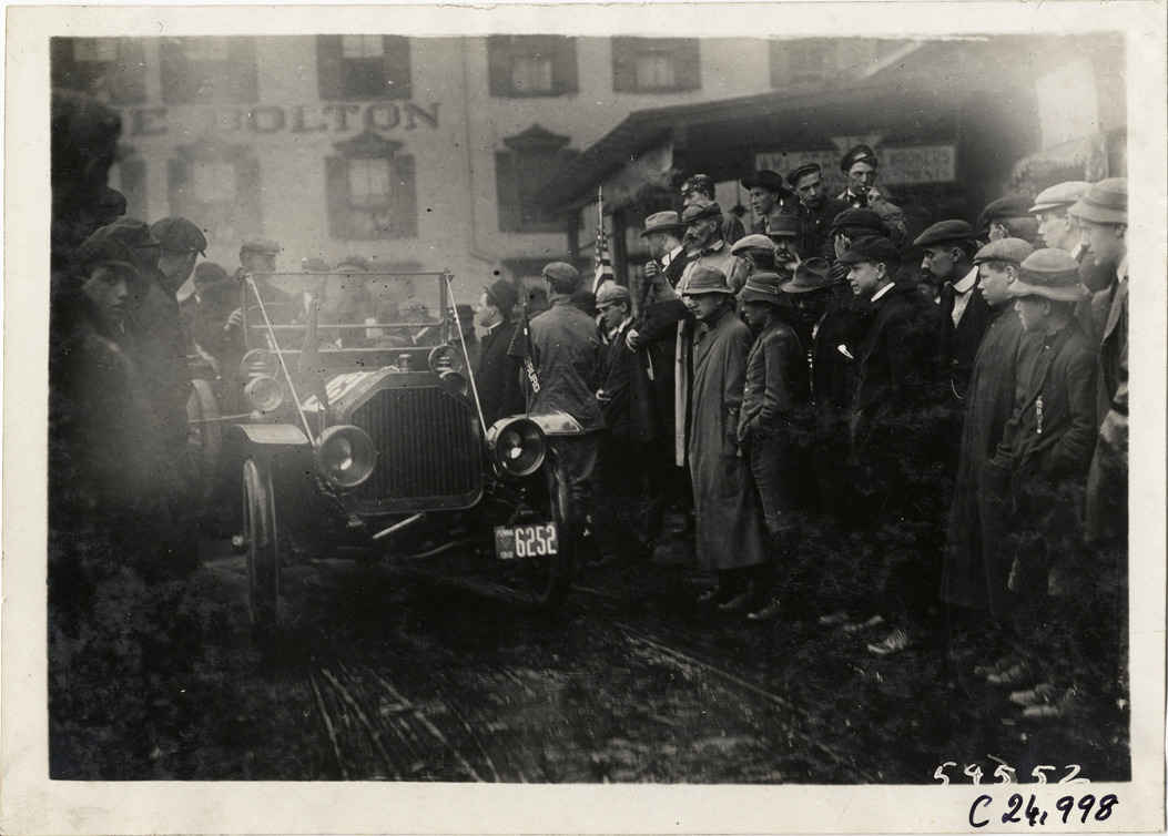 View of motorists in car no. 18, surrounded by spectators, at Harrisburg, Pennsylvania during the 1910 Harrisburg Endurance Run. Bolton Hotel in background. The Motor Club of Harrisburg, Pennsylvania sponsored spring and fall reliability contests which covered routes through Pennsylvania, Maryland and New Jersey. Stamped on back: "Spooner & Wells, Inc., photographers, telephones 3472-3473 Columbus, 1931 Broadway, New York." Handwritten on back: "Tours--Harrisburg Endurance Run, 1910."