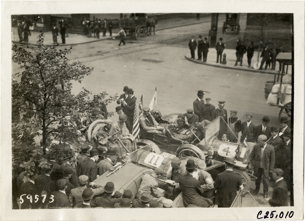 View of spectators surrounding motorists in car no. 11 and car no. 4 during the 1910 Harrisburg Endurance Run. The Motor Club of Harrisburg, Pennsylvania sponsored spring and fall reliability contests which covered routes through Pennsylvania, Maryland and New Jersey. Stamped on back: "Spooner & Wells, Inc., photographers, telephones 3472-3473 Columbus, 1931 Broadway, New York." Handwritten on back: "Tours--Harrisburg Endurance Run, 1910."