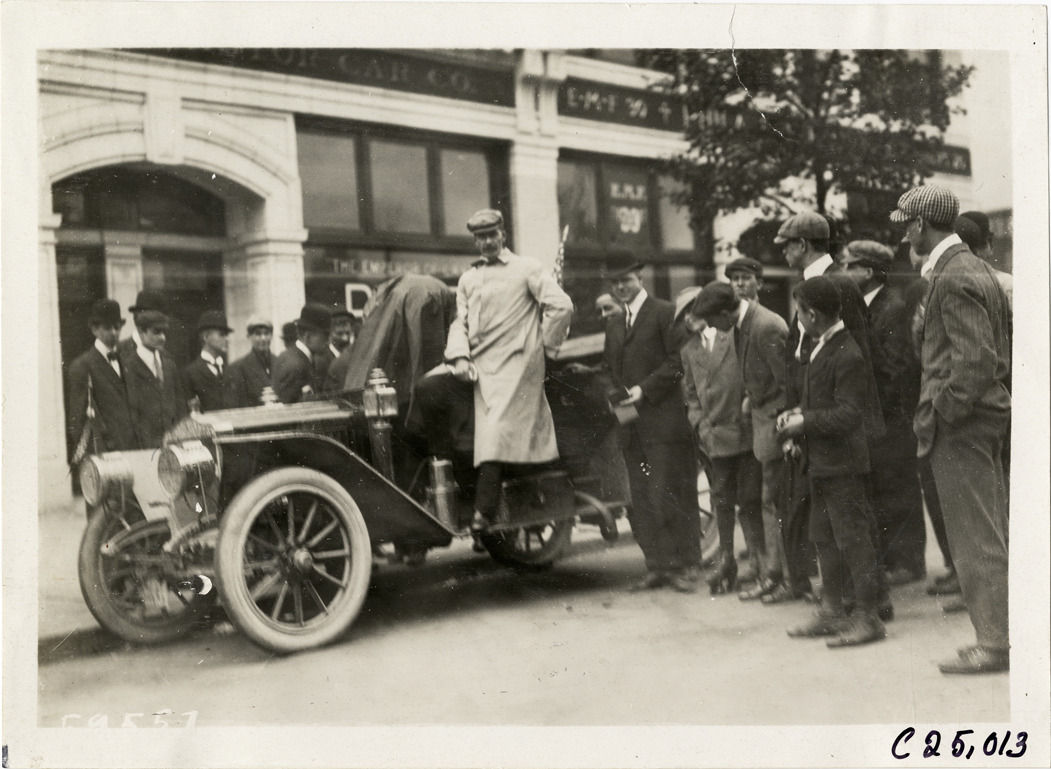 View of motorist posing in car, surrounded by spectators, during the 1910 Harrisburg Endurance Run. The Motor Club of Harrisburg, Pennsylvania sponsored spring and fall reliability contests which covered routes through Pennsylvania, Maryland and New Jersey. Stamped on back: "Spooner & Wells, Inc., photographers, telephones 3472-3473 Columbus, 1931 Broadway, New York." Handwritten on back: "Tours--Harrisburg Endurance Run, 1910."