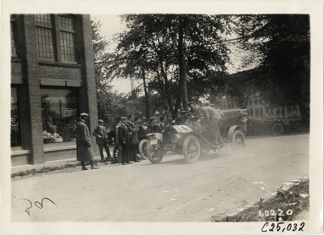 View of motorists with Regal car no. 4 at Bridgeport, Connecticut during the 1910 Hartford Endurance Run. Spectators stand on sidewalk; Bridgeport Vehicle Company building in background. Sponsored by the Automobile Club of Hartford, the reliability run was also known as the All-Connecticut run. Stamped on back: "Spooner & Wells, Inc., photographers, telephones 3472-3473 Columbus, 1931 Broadway, New York." Handwritten on back: "Tours--Hartford Endurance Run, 1910."
