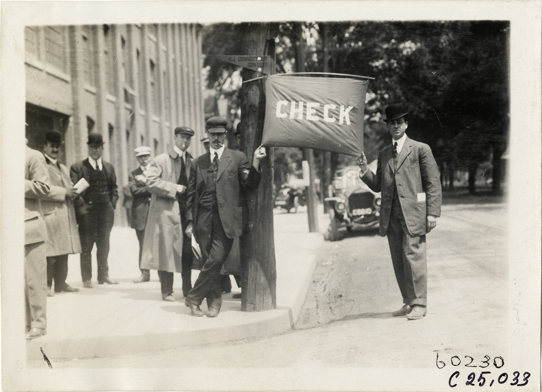View of two officials posing with "Check" banner on street corner during the 1910 Hartford Endurance Run. Spectators stand on sidewalk. Sponsored by the Automobile Club of Hartford, the reliability run was also known as the All-Connecticut run. Stamped on back: "Spooner & Wells, Inc., photographers, telephones 3472-3473 Columbus, 1931 Broadway, New York." Handwritten on back: "Tours--Hartford Endurance Run, 1910."