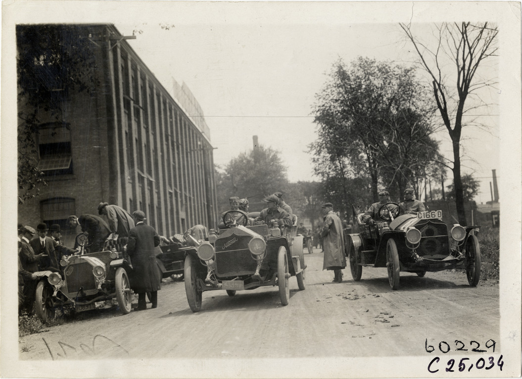 View of motorists with Cartercar and National cars at Bridgeport, Connecticut during the 1910 Hartford Endurance Run. National car no. 8 on right; Bridgeport Vehicle Company building in background. Sponsored by the Automobile Club of Hartford, the reliability run was also known as the All-Connecticut run. Stamped on back: "Spooner & Wells, Inc., photographers, telephones 3472-3473 Columbus, 1931 Broadway, New York." Handwritten on back: "Tours--Hartford Endurance Run, 1910."