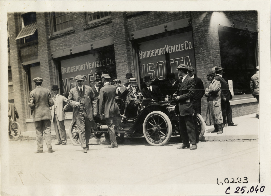 View of motorists and spectators with car in front of Bridgeport Vehicle Company building at Bridgeport, Connecticut during the 1910 Hartford Endurance Run. Sponsored by the Automobile Club of Hartford, the reliability run was also known as the All-Connecticut run. Stamped on back: "Spooner & Wells, Inc., photographers, telephones 3472-3473 Columbus, 1931 Broadway, New York." Handwritten on back: "Tours--Hartford Endurance Run, 1910."