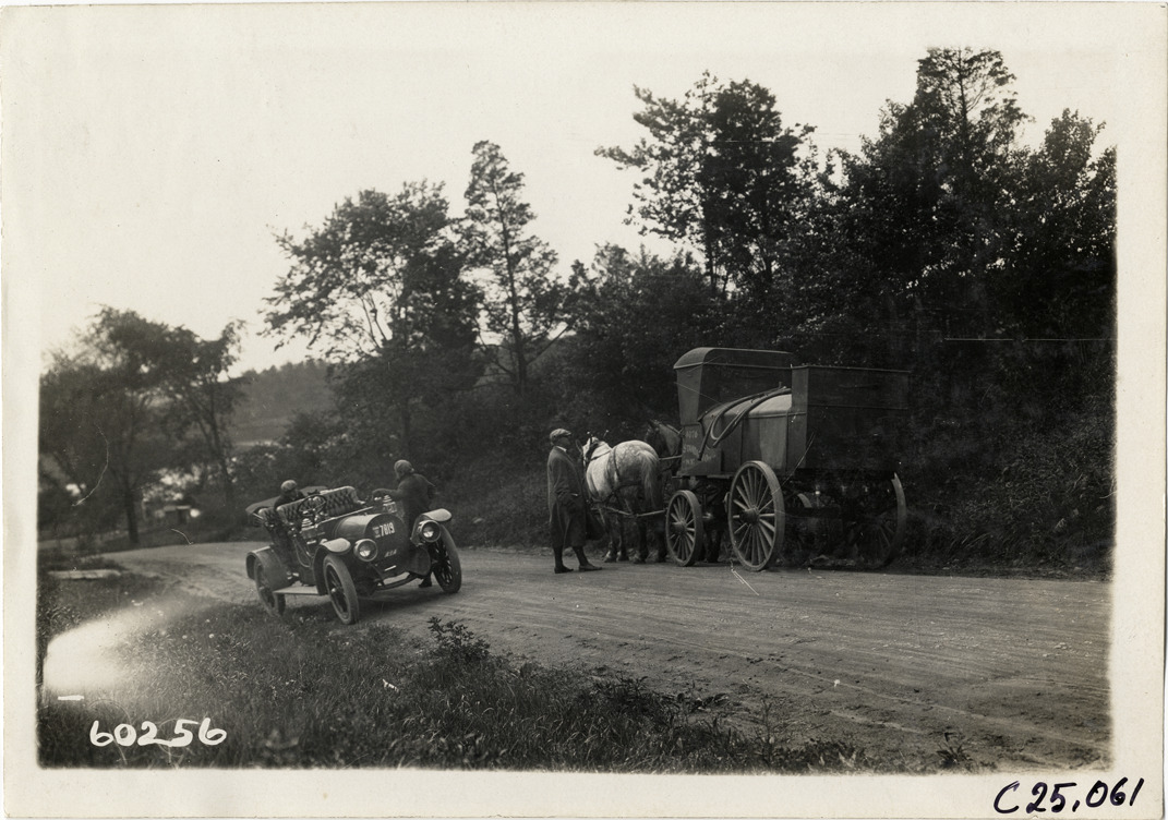 View of W.R. Coughtry approaching horse-drawn Standard Oil wagon on rural dirt road during the 1910 Hartford Endurance Run. Car is parked on roadside. Sponsored by the Automobile Club of Hartford, the reliability run was also known as the All-Connecticut run. Stamped on back: "Spooner & Wells, Inc., photographers, telephones 3472-3473 Columbus, 1931 Broadway, New York." Handwritten on back: "Tours--Hartford Endurance Run, 1910."