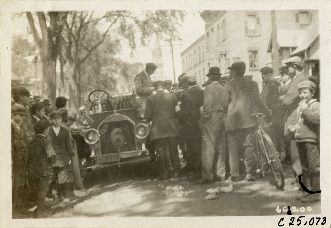 View of spectators surrounding motorists in Cartercar no. 6 during the 1910 Hartford Endurance Run. Sponsored by the Automobile Club of Hartford, the reliability run was also known as the All-Connecticut run. Stamped on back: "Spooner & Wells, Inc., photographers, telephones 3472-3473 Columbus, 1931 Broadway, New York." Handwritten on back: "Tours--Hartford Endurance Run, 1910."