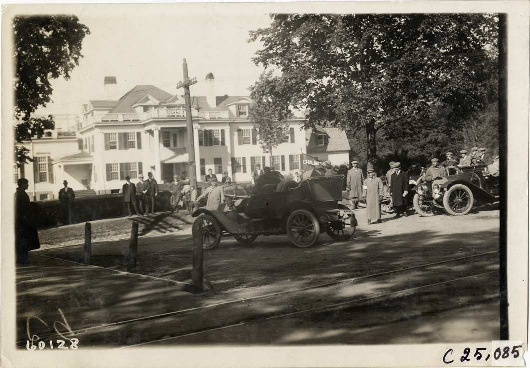 View of motorists in Chalmers car passing group of spectators on roadside during the 1910 Hartford Endurance Run. Mansion in background. Sponsored by the Automobile Club of Hartford, the reliability run was also known as the All-Connecticut run. Stamped on back: "Spooner & Wells, Inc., photographers, telephones 3472-3473 Columbus, 1931 Broadway, New York." Handwritten on back: "Tours--Hartford Endurance Run, 1910."