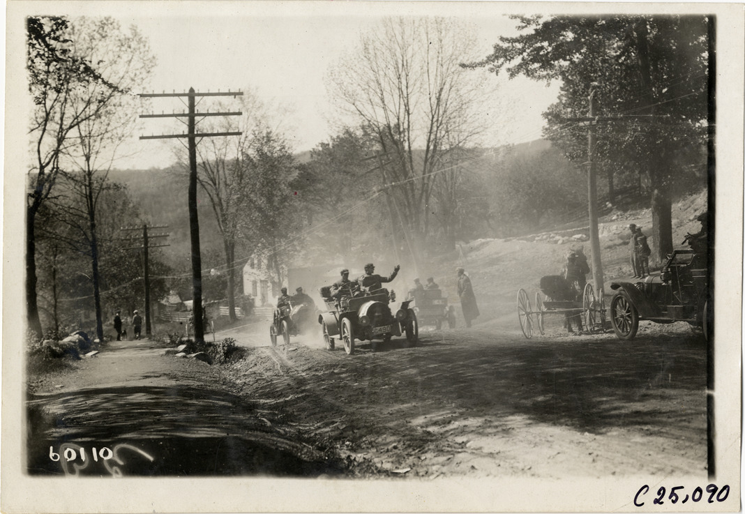 View of motorist in Franklin car no. 3 greeting spectators on roadside during the 1910 Hartford Endurance Run. Another car follows closely behind. Sponsored by the Automobile Club of Hartford, the reliability run was also known as the All-Connecticut run. Stamped on back: "Spooner & Wells, Inc., photographers, telephones 3472-3473 Columbus, 1931 Broadway, New York." Handwritten on back: "Tours--Hartford Endurance Run, 1910."