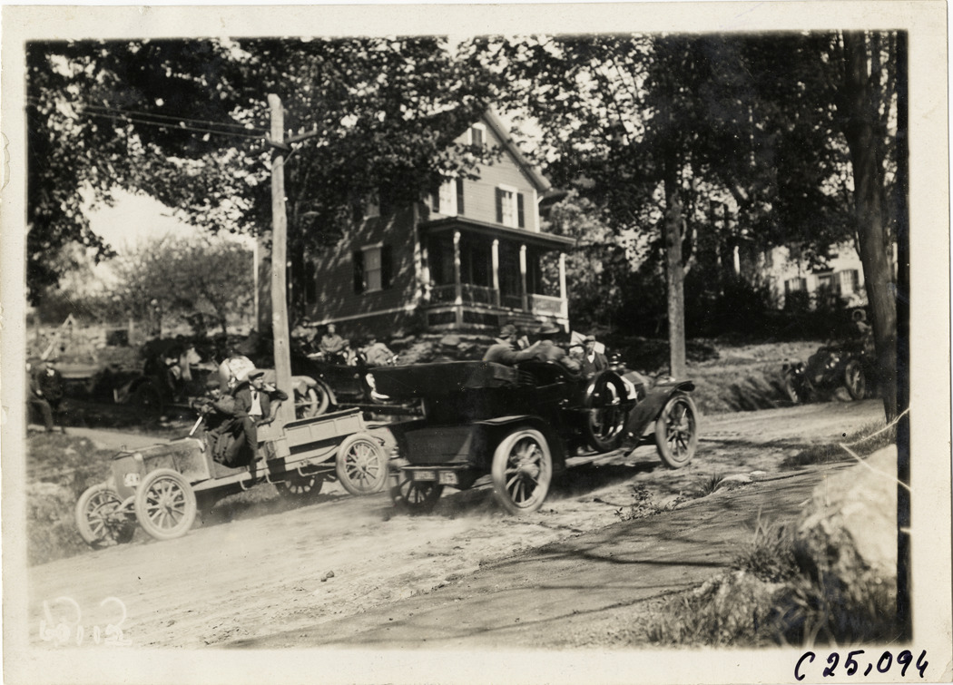View of motorists in car passing car on roadside during the 1910 Hartford Endurance Run. Wooden-frame house in background. Sponsored by the Automobile Club of Hartford, the reliability run was also known as the All-Connecticut run. Stamped on back: "Spooner & Wells, Inc., photographers, telephones 3472-3473 Columbus, 1931 Broadway, New York." Handwritten on back: "Tours--Hartford Endurance Run, 1910."