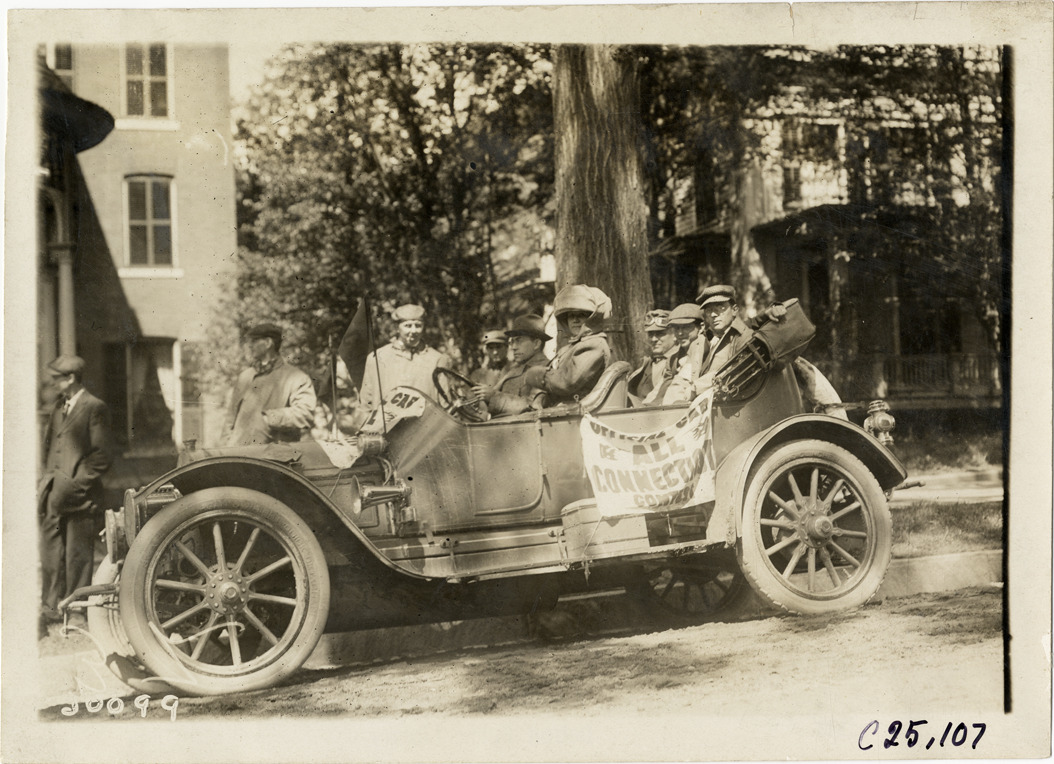 View of motorists in official car during the 1910 Hartford Endurance Run. "Official car, All Connecticut Contest" banner is displayed on side of car; houses in background. Sponsored by the Automobile Club of Hartford, the reliability run was also known as the All-Connecticut run. Stamped on back: "Spooner & Wells, Inc., photographers, telephones 3472-3473 Columbus, 1931 Broadway, New York." Handwritten on back: "Tours--Hartford Endurance Run, 1910."