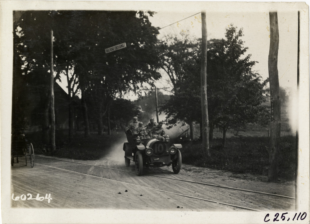 View of motorists in Franklin car no. 10 crossing tracks at railroad crossing during the 1910 Hartford Endurance Run. Sponsored by the Automobile Club of Hartford, the reliability run was also known as the All-Connecticut run. Stamped on back: "Spooner & Wells, Inc., photographers, telephones 3472-3473 Columbus, 1931 Broadway, New York." Handwritten on back: "Tours--Hartford Endurance Run, 1910."