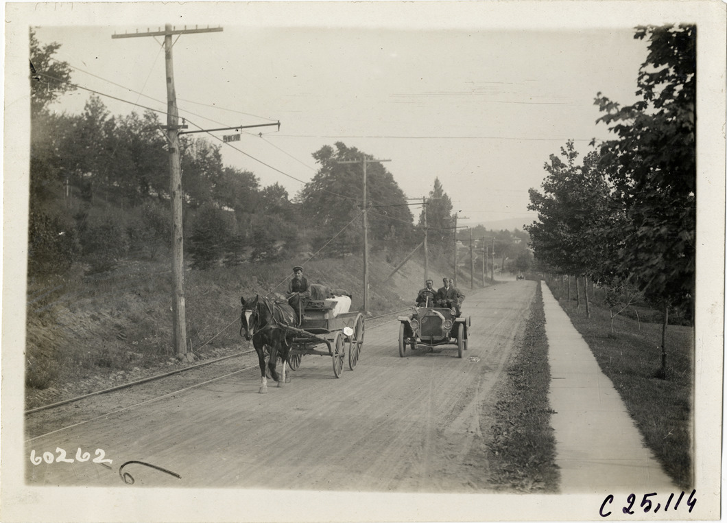 View of motorists in Cartercar passing horse-drawn wagon on rural dirt road during the 1910 Hartford Endurance Run. Sponsored by the Automobile Club of Hartford, the reliability run was also known as the All-Connecticut run. Stamped on back: "Spooner & Wells, Inc., photographers, telephones 3472-3473 Columbus, 1931 Broadway, New York." Handwritten on back: "Tours--Hartford Endurance Run, 1910."