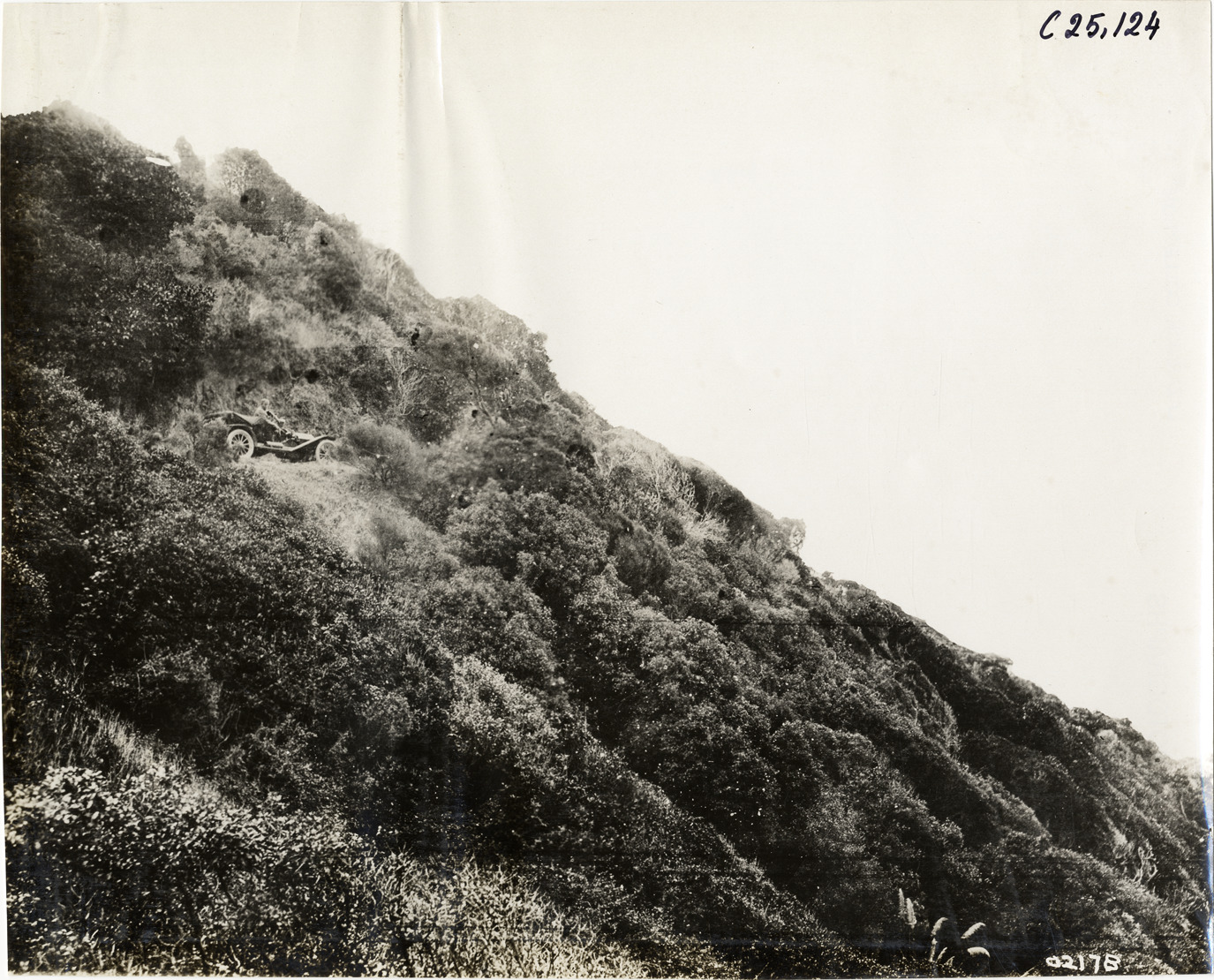 Distant view of driver in Hupmobile car traveling on mountain road in New Zealand during the 1910 Hupmobile Round the World tour. The expedition, which left from Detroit, Michigan, was a demonstration of Hupmobile efficiency throughout the U.S., Hawaii, the Fiji Islands and New Zealand. Handwritten on back: "New Zealand. Tours--Hupmobile Round the World Tour, 1910."